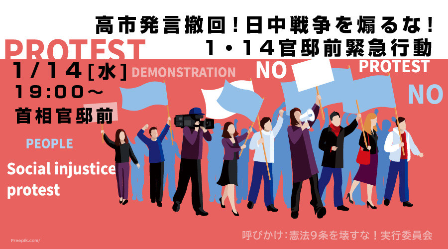 『高市発言撤回!日中戦争を煽るな!1・14官邸前緊急行動』( #0114官邸前緊急行動 #高市総理の発言撤回を求めます #トランプに忖度するな #国際法違反をスルーするな )